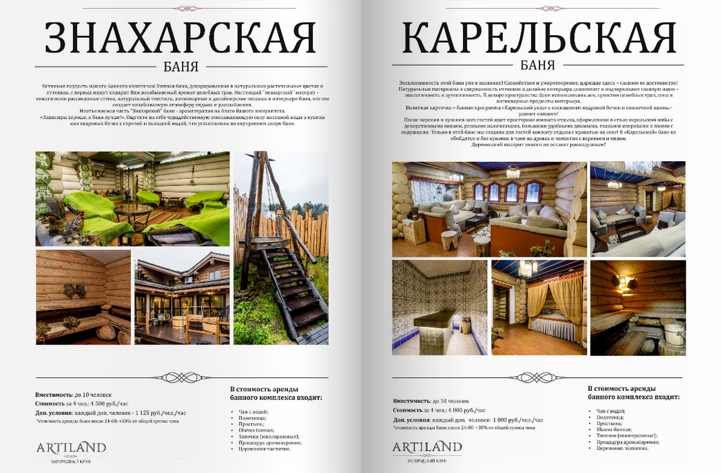 Будучи неисчерпаемым источником красоты и здоровья, русская баня веками помогала нашим предкам очищать тело и душу. Банный комплекс ARTILAND предлагает в полной мере испытать, что такое правильная дровяная баня «по-черному». Ощущение чистоты и обновления после парения усиливают специально подобранные спа-процедуры, дающие особый эффект при высоких температурах.