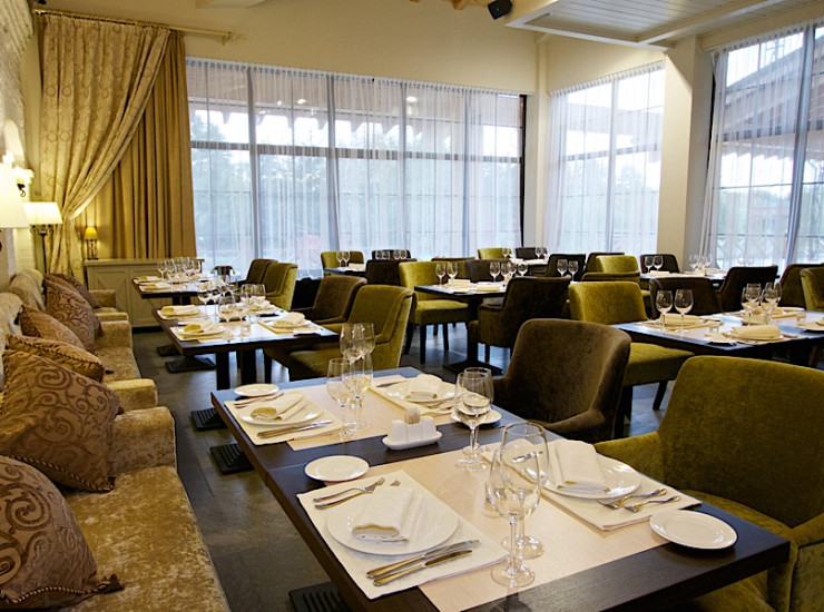 Главный ресторан загородного клуба . Огромный выбор блюд и напитков по меню. Также в ресторане расположена барная стойка и камин. Также предусмотрено пространство для детской зоны.