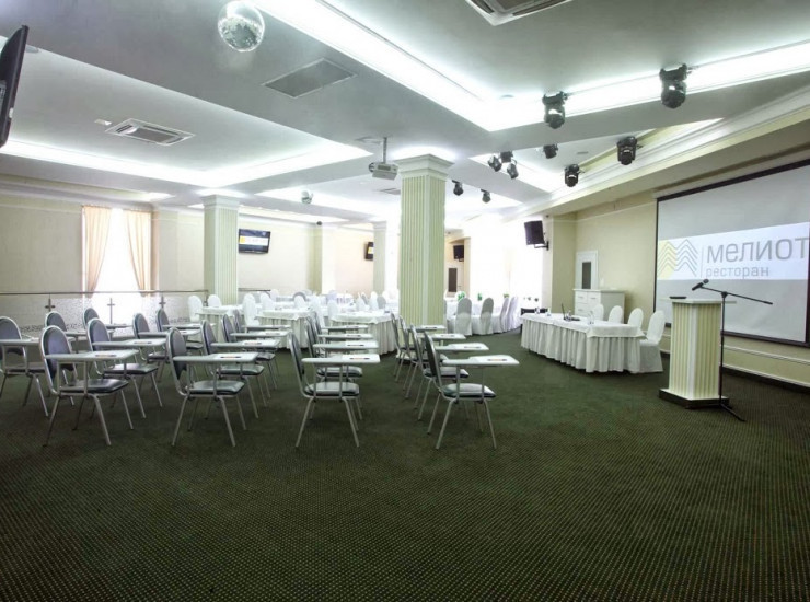 Конференц-холл Мелиот на 150 человек, стоимость аренды от 2 000 руб./час. Проектор, экран, микрофон и система звукоусиления, флипчарт с маркерами и бумагой, трибуна, сопровождение мероприятия (по запросу), просторная терраса, бесплатный Wi-Fi.