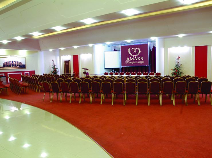 Площадь зала - 90 кв.м. Конференц-зал находится на втором этаже гостиницы «АМАКС Конгресс-отель» (золотой национальный этаж). В конференц-зале созданы прекрасные условия для работы и организации презентаций и мастер классов. Вместимость до 70 человек.