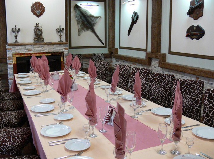 Площадь зала - 50 кв.м. Зал расположен на первом этаже отеля в непосредственной близости от ресторана. В этом зале наши гости смогут погрузиться в атмосферу старины, ощутить себя у настоящего охотничьего камелька. Вместимость до 35 человек.