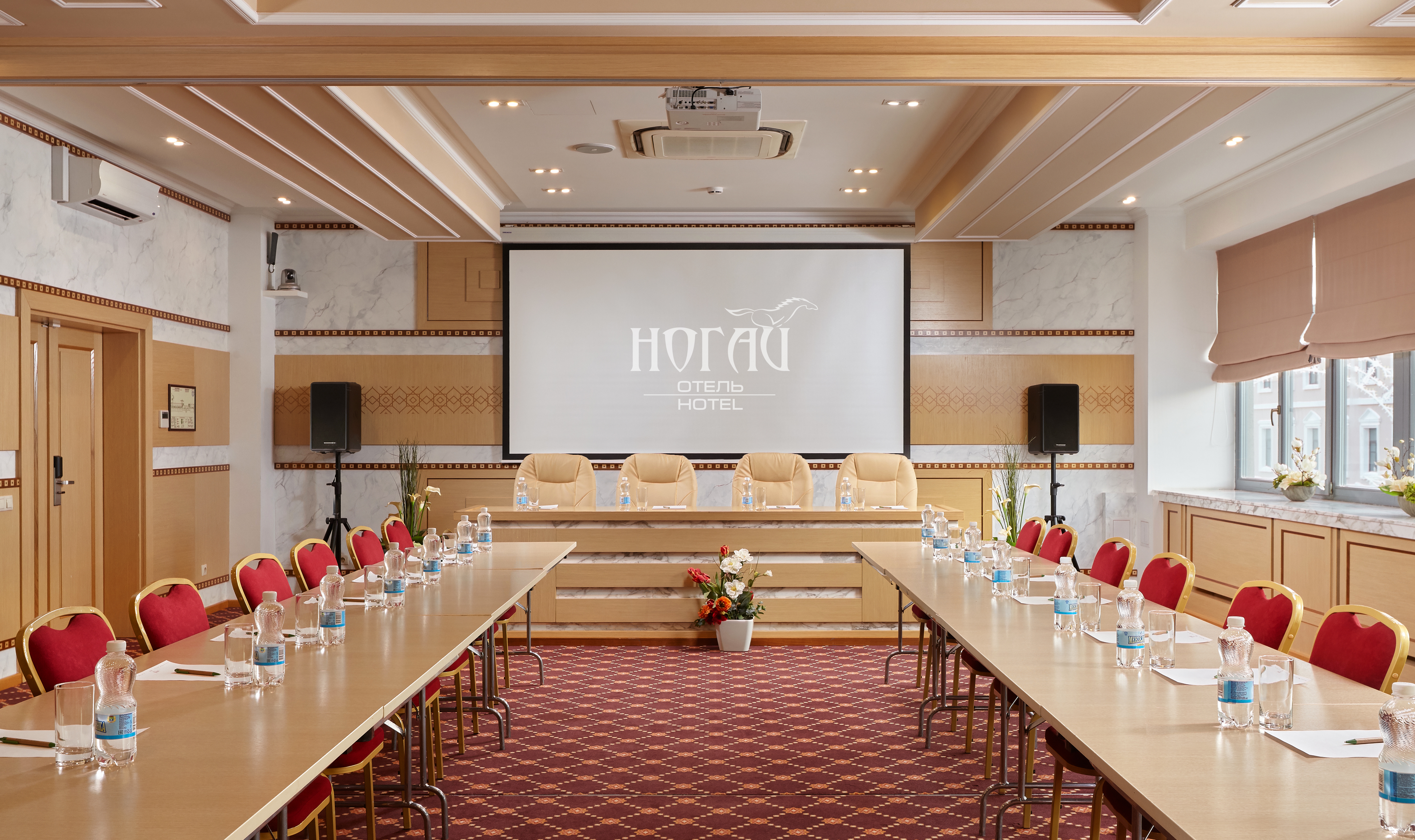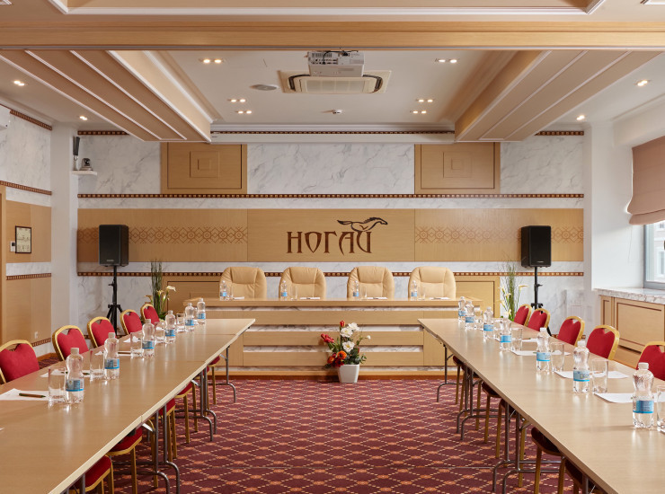 Новый современный и удобный конференц-зал Ногай предоставляет возможность трансформации, зал можно использовать полностью или разделить его на три модуля. В данном случае помещение разбивается на три зоны и оборудование распределяется по ним в соответствии с назначением этих помещений. Ведь превращение обычного круглого стола в высококлассное оснащенное пространство для коллективной работы позволяет вывести мероприятие на новый уровень.