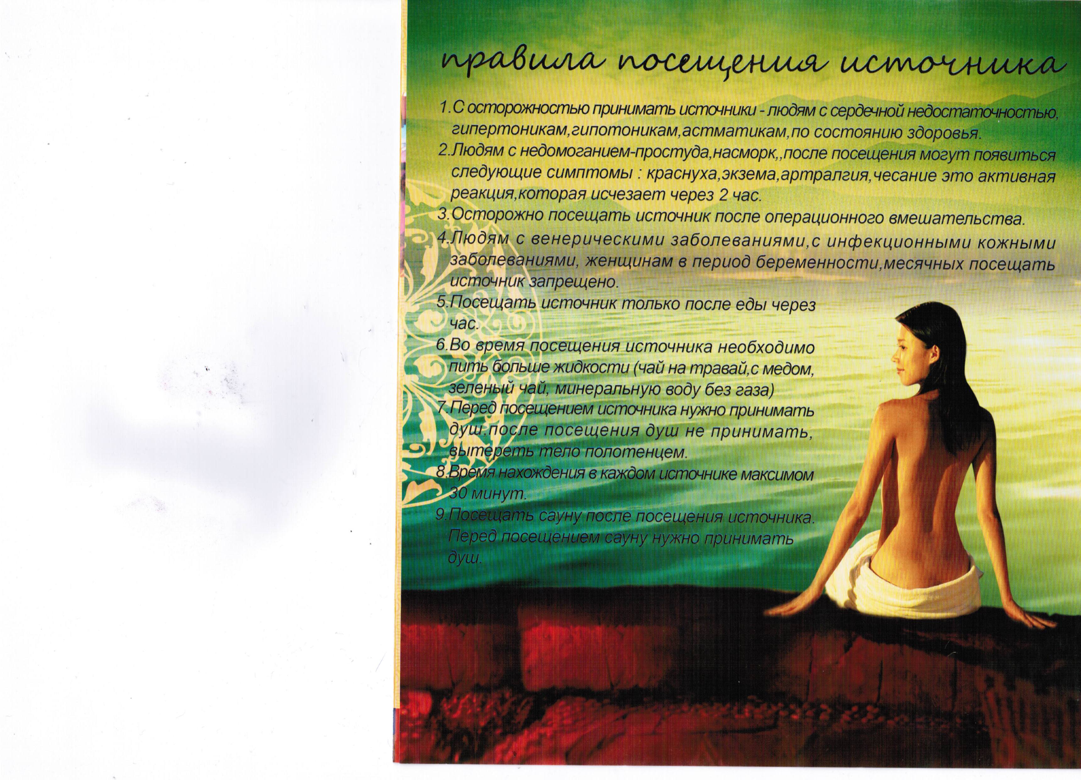 Используются горные воды из подземной глубины при нагревании до 38-42 градусов по цельсню, добавляют в источники разновидные лекуарственные травы, полезные для человеска горные элементы, такие как селен, кальций, источник имеет антиокислительный, противстарения и косметический эффекты. Источники окружают горы и залёная растительность, что придает весеннынее время года, человек и небо составляет одно целое.