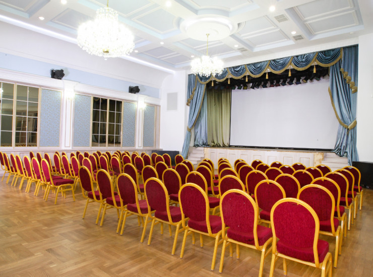 Очень красивый зал, царские интерьеры, канделябры на стенах, массивные люстры из хрусталя, небольшая сцена. Площадь 139 кв.м. Вместимость: 50 человек.