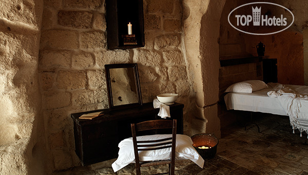Этот отель, расположенный в городе Матера, на юге Италии, стал известен благодаря своему аскетичному пещерному интерьеру в стилизованных комнатах-гротах: мебель из натурального дерева и войлока, множество свечей, расставленных по всему номеру. И хотя здесь отсутствуют такие привычные на отдыхе вещи, как мини-бар и холодильник в номере, это нисколько не умаляет ту уединённую атмосферу спокойствия и комфорта, которую легко может ощутить любой гость отеля.