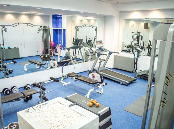 Уютный фитнес зал с беговой дорожкой, велосипедом, силовой скамьей, кроссовер, набор гантелей.