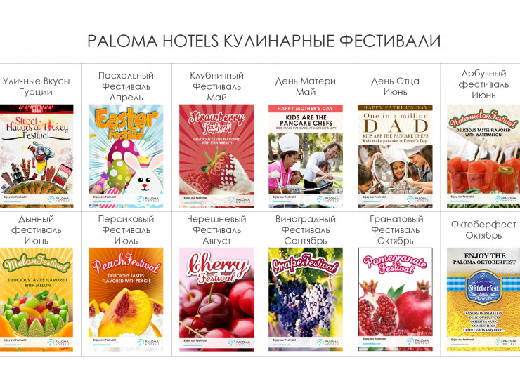 Food Festival - так именуется праздник, который проводится во всех отелях сети PALOMA. Клубничный, Виноградный, Персиковый, Пасхальный, Октоберфест - и другие фестивали проводятся в отелях PALOMA каждый сезон, радуя гостей тематическими угощениями, декорациями, развлечениями и просто веселой атмосферой...