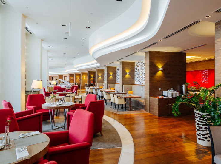 Лобби-бар создан для приятного делового и дружеского общения, а плавные линии, белый рояль и несколько отдельных мягких зон подчеркивают особенность этого места. Бар рассчитан на 40 персон.