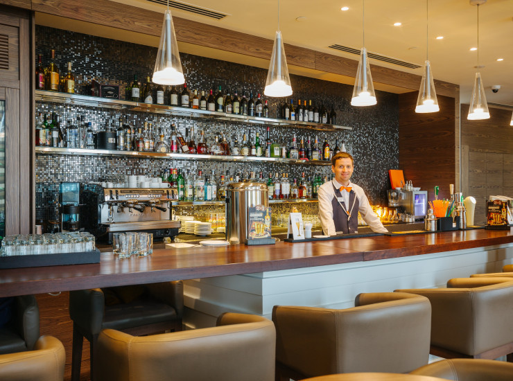 Интерьер выполнен в современном стиле, зона у барной стойки выдержана в спокойных темных тонах. Тут можно выпить кофе в ожидании собеседника, перекусить сэндвичем, а расширенная винная карта может превратить деловое общение в дружескую беседу.