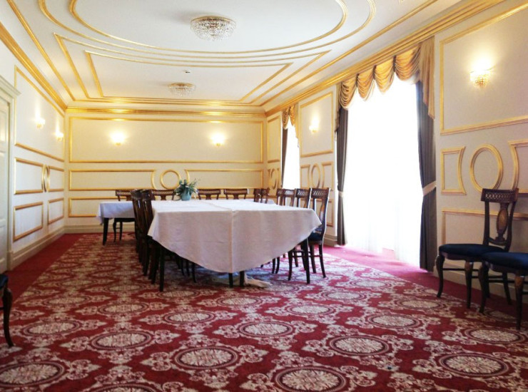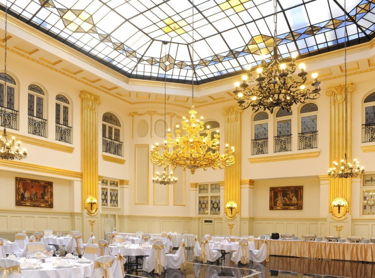 Если Вам ещё не довелось побывать в ресторане Отеля в захватывающем дыхание Стеклянном Зале то Вы ещё не пережили это патетическое состояние, которое вызывает огромное внутренне пространство со множеством художественных композиций их цветного стекла и миллионов источников света в сочетании с черным мраморным полом, сдобренное чувством домашнего уюта. Это особенное настроение, излучаемое окружением, венчают мастера кулинарного искусства Отеля своими известными на всю страну вкусовыми композициями. Взыскательно обновленный Стеклянный Зал может одновременно принять за своими столами 160 гостей или устроить приём для 200 участников. Этот зал часто выбирают молодожены для пышного свадебного ужина или предприятия, для проведения важных деловых приёмов.