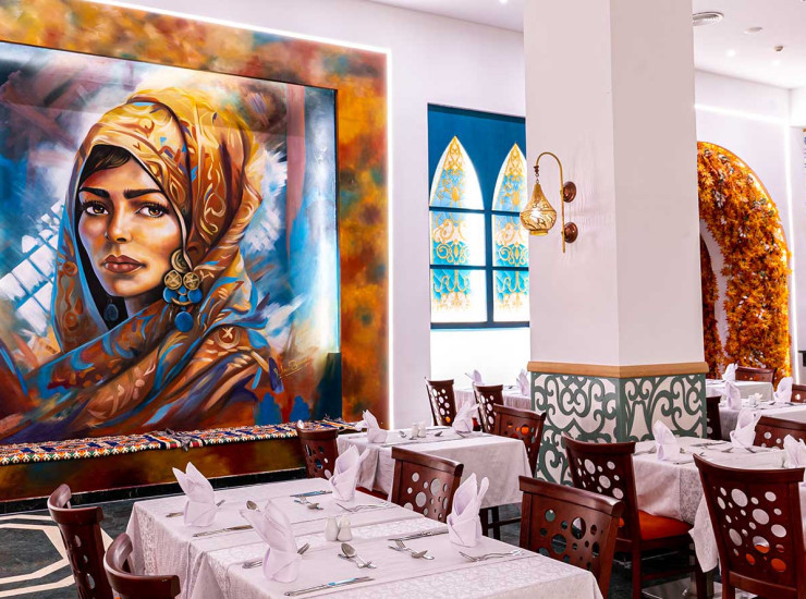 В ресторане подаются блюда Египетской, Ливанской, Мороканской кухни с 2-х недельного меню. Здесь большой выбор хлеба и восточных пирогов. Восточный хлеб с различными ароматами свежей выпечки прямо из фермерской духовки.