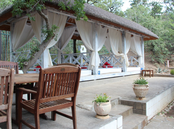 Территория представляет собой бунгало с шезлонгами, зона WI-FI, детская горка с песочницей, качели.