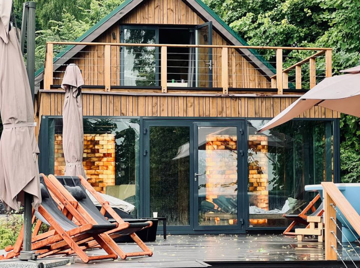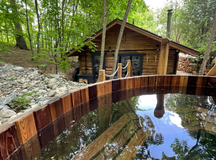 Каждая баня имеет панорамную парную, свою зону отдыха, подогреваемую кедровую бочку "Фурако" на свежем воздухе и качели с сеном.