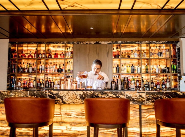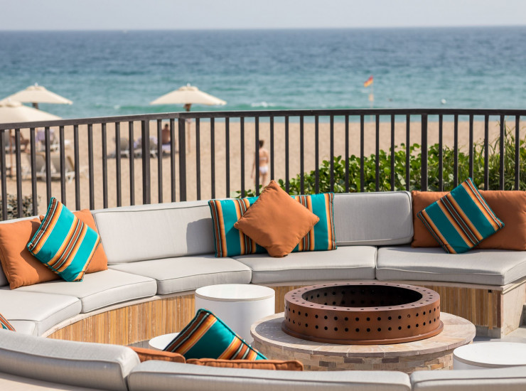 Лобби лаунж и бар со своей открытой террасой, откуда открывается панорамный вид на терретория отеля и на пляж.