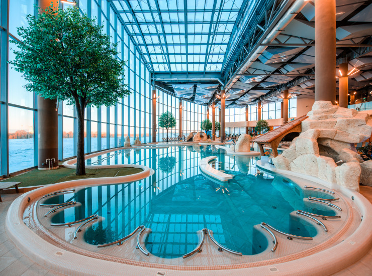 К услугам гостей: ультрасовременный бассейн с морской водой, гидромассажем и пул-баром. На улице, под открытым небом находится горячий источник со 100% природной минеральной водой. В бассейн площадью 400 м² из собственной скважины глубиной 1248 м поступает по-настоящему целебная вода, насыщенная полезными микроэлементами. Также гости могут расслабиться и насладиться гидромассажем в минеральных и контрастных джакузи, попариться в жарких банях и саунах различных традиций, заказать авторские программы: парения, спа-ритуалы, комплексный уход за лицом и телом с применением лучшей сибирской косметики.