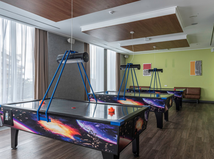 Спортивные площадки, где можно играть в футбол, волейбол, пионербол и прочие игры. Так же есть настольный теннис. Отдельная площадка с тренажерами.