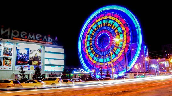 Cамый большой аттракцион в Уфе: колесо обозрения "Иремель". Колесо является первым по высоте в Приволжском Федеральном Округе и третьим по РФ. Находится прямо напротив Отеля Иремель.