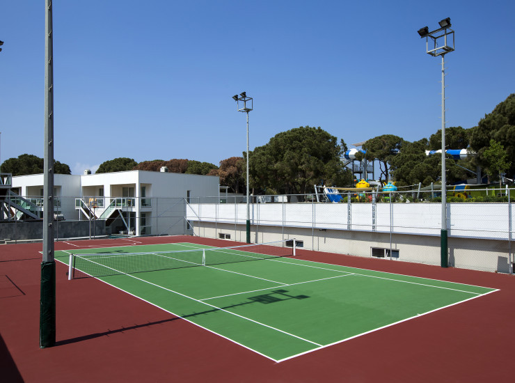 теннисный корт (с твердым покрытием) с освещением, мячи и ракетки;