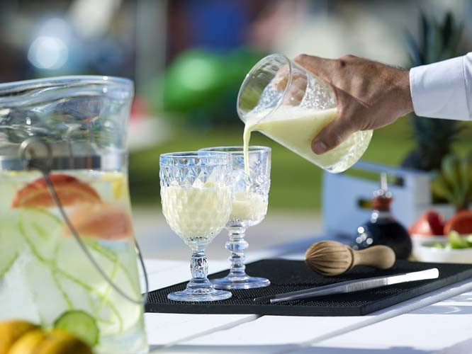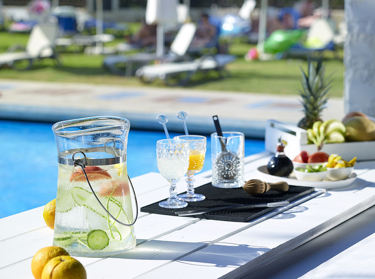 В баре у бассейна CALYPSO вам предложат широкий ассортимент напитков: фильтр-кофе, кофейные напитки, растворимый кофе, вода, безалкогольные напитки, травяные и фруктовые чаи, вино, разливное пиво, фруктовый сок, бренди, узо, раки, импортные алкогольные напитки, мороженное и граниты.