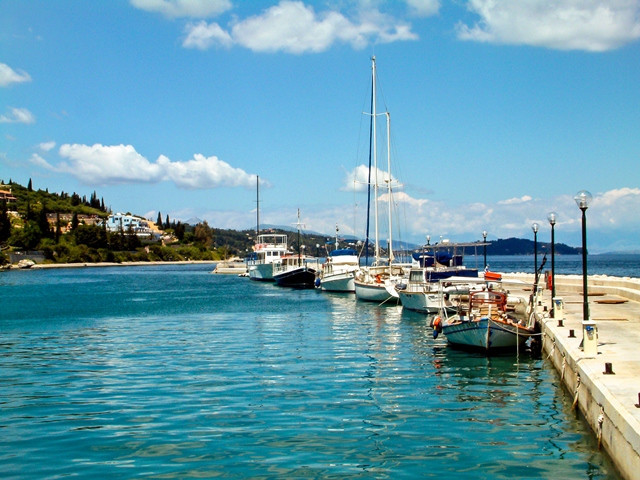 The water on the shores of Benitses is gradient in shades of blue; from crystal, to aquamarine, to cerulean.