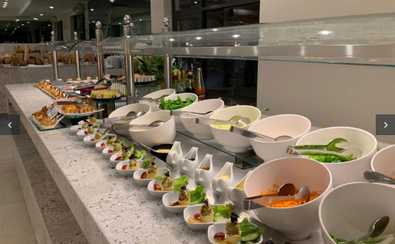 В ресторане есть богатый салат-бар с секцией для сырых овощей, различных заправок и приправ, где вы можете приготовить свой собственный салат, станции по приготовлению пасты и нарезке, а также уголок с мороженым.