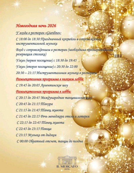 С 19:30 начинается новогодний гала-ужин — изысканные блюда, живая музыка и атмосфера праздника.