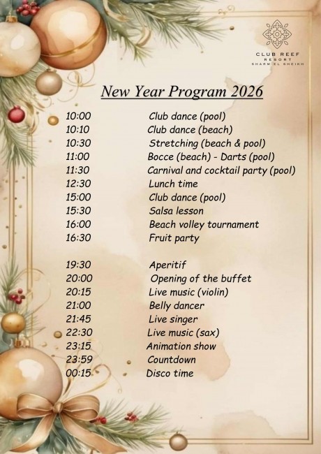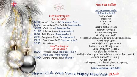 Sharm Club Beach Resort 4★ приглашает гостей встретить Новый 2026 год на живописном побережье Красного моря. Праздничная ночь пройдёт в атмосфере уюта, веселья и восточного колорита.