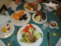 4) Еда. Еда в принципе нас устроила. Мы не мясо еды , хотя там был приличный гуляш. Рыбка вкусненькая . На завтрак была каша рисовая - я люблю каши. Муж омлет ел. Был их йогурт - наша простокваша я наливала в неё то мёд, то сироп шиповника. Ели грейпфрут , мандарины в общем норм! Молоко вкусное я им хлопья заливала. Да в рестораны а ля карт и в правду лучше не ходить не тратить драгоценные вечера отдыха! Рестораны классные в Наама Бей там за 20 баксов можно большое блюдо море продуктов заказать. А вообще каждый день из-за наших вылазок или экскурсий - вылетал то обед то ужин.