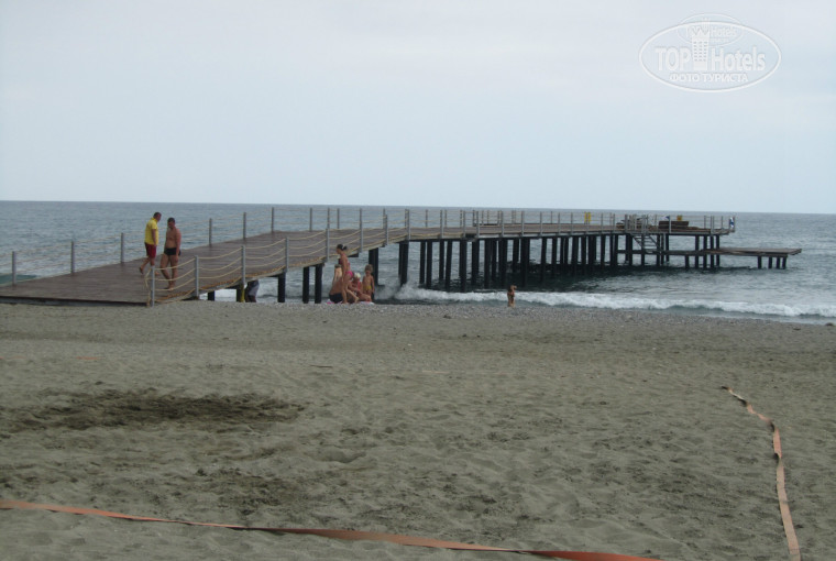 Пляж находится немного левее отеля, поэтому и набегает 400 метров. Нужно пересечь одну дорогу, пройти к заправке, и там по подземному переходу. Указатели есть небольшие. Шли минут 5-7. Также можно на автобусе, ходит он, как заметили, не по расписанию. Иногда случайно ловили его, когда шли. Подвозит к подземному переходу. Лежаков всегда достаточно, но, стоит прийти пораньше, чтобы занять "ракушку". Очень уж понравилось это спальное место, так сказать. Пирс уже достроили, но прыгать с него не разрешают, т.к. на дне каменные глыбы. Заход в море от камней расчистили. Морем довольны. В начале отдыха были приличные волны-веселились, потом спокойнее. Метрах в 20 в море впадает ручеек из горной речки. От этого, периодически, попадаются участки с холодной водой. Играли в волейбол в 11 и в 16 часов. Душ функционирует. Бар на пляже открывается в 10-00. С 12-00 - обеденное время(фрукты, овощи, салатики, пиццы, гамбургеры, шаурма). Все очень вкусно. На обед в отель ходили пару-тройку раз. С пяти вечера персонал начинает готовить столы для а-ля карт. Но напитки еще наливают.