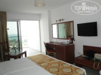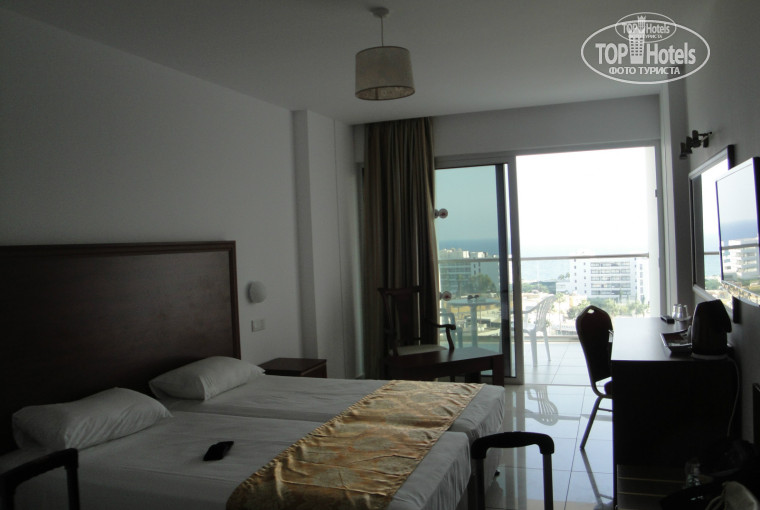 Отдыхали в этом отеле с 30.08. по 12.09.2014 г. Понравились отзывы и решили выбрать этот отель. Одним из плюсов в пользу этого отеля - наличие русскоговорящего персонала. Т/О "Верса". Прилетели вовремя, от аэропорта г. Ларнаки до отеля около часа езды. Приехали часов в 5 вечера по местному времени, сразу заселились, номер заказывали ДеЛюкс, 5-ый этаж, № 510. Номер большой, балкон большой, вид на море шикарный!!! В номере все новое: мебель, ванна, раковина, сантехника. Также у нас был сейф, холодильник, фен, чайник, плоский ТВ, пульт. Кондей работал хорошо. В ванне 2 больших полотенца, 2 маленьких, одно для ног, 2 шампуня, 2 мыла (мы ими не пользовались, т.к. привезли все свое). В номере также приветственный набор: в холодильнике 2 бутылки воды по 0,5 л, кофе, чай, молоко, сахар.