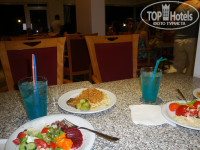 Приехали, сходили на пляж и сразу на ужин. Ужин на протяжении всего нашего отдыха был каждый день разный: 3 вида салата, помидоры (ну очееень вкусные), огурцы, свекла, оливки, мясо, курица, рыба, морепродукты, картофель (тоже вкусный), рис, макароны, напитки платные (мы брали иногда коктели, они в отеле за 3 евро - вкусные) и.т.д., какие-то десерты, дыня или арбуз (не очень сладкие), мороженое (ну, так съесть можно). Завтраки почти каждый день одинаковые: овощи, 2 вида омлета, яичница, яйцо вареное (всего 2 раза было), 2 вида сосисок, бекон (не каждый день), апельсины (очень сладкие и вкусные), хлопья, блины (дома вкуснее), напитки всевозможные. Голодными не сидели. Все очень вкусно и качественно приготовлено. Спасибо повару!!!