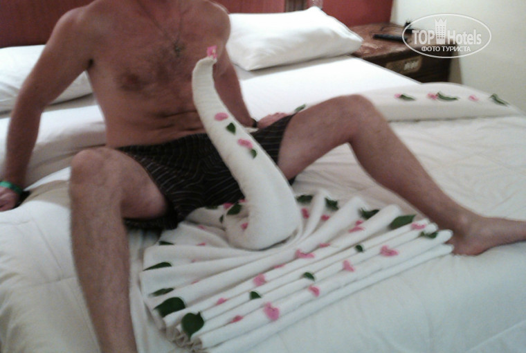 2. Номер (№610) аккуратный, все работает. За заселение ничего не платил. Уборка, замена полотенец и вода в холодильнике ежедневно. За доллар лебеди, цветы в вазу и лепестки по кровати. Холодильник, ТВ, фен. В ванной жидкое мыло и шампунь/гель (в дозаторе). Вода всегда вся. Вокруг номера красиво, цветы вокруг окна и кактус цветущий.