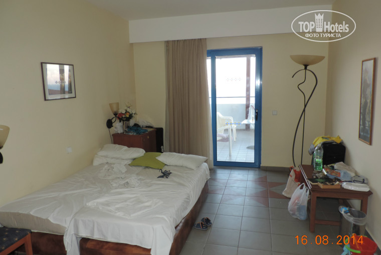 Отдыхали в этом отеле с 4 по 17 августа 2014 года семьей с двумя детьми (10 и 2,9). Прилетели рано, в отеле были к завтраку. На ресепшен попросили оставить вещи в холле и сходить на завтрак, мы так и сделали. Затем сходили искупались, позагорали и, вернувшись на ресепшн, получили ключи от своего 420 номера. Заказан у нас был Family Superior 2 Rooms, его и получили. Номер оказался на пятом этаже главного корпуса. Вполне хороший номер, с огромнейшим балконом и великолепным видом на море. В номере есть холодильник, 1 телевизор, 1 кондиционер, неработающая плита (видимо раньше в этом отеле было предусмотрено приготовление еды в номерах), много шкафов и комодов для одежды. Санузел просторный, полностью укомплектован. Прочитав перед поездкой отзывы, привезли шампуни, гели и мыло с собой. Убирались и меняли полотенца каждый день, оставляли 1€ ежедневно. Пляж расположен в непосредственной близости от корпуса. Лежаки на берегу моря платные (2 лежака + зонтик + 2 бутылки воды по 0,5 – 7€), около бассейна – нет, но чаще всего отдыхающие занимали их на весь свой отпуск, оставляя полотенца на ночь. Опять же, прочтя отзывы, мы привезли с собой пару покрывал и замечательно располагались под пальмами недалеко от бассейна, так как младший ребенок категорически хотел купаться в бассейне, а не в соленом море. Пляж неплохой, вход в воду песчаный, но в воде есть и камни, причем большие. Приглядели место, где их поменьше, там и заходили в воду всегда. Так как пляж в небольшой бухте, волн не было совсем. Море превосходное, очень чистое и теплое. Ресторан расположен на открытой площадке около пляжа, с видом на море. Иногда были проблемы со свободными местами в ресторане, но внимательный персонал помогал найти, куда можно присесть и приносил приборы. Питание вполне сносное: мясо и рыба каждый день. Свежую еду приносили сразу же, как заканчивалось содержимое лотков. Один раз за две недели делали шашлык и пончики, очередь была огромная. Наличие фруктов зависело от времени прихода в ресторан. Не понравилось периодическое отсутствие чашек и стаканов, приходилось ждать часто. Территория отеля небольшая, уютная и тихая. Очень не хватает детской площадки. Анимация минимальная. Нам это было не нужно, поэтому для нас это как положительное качество отеля. Аква-аэробика, дартс со штрафным купанием в бассейне, водное поло, вечерняя анимация для детей и для взрослых, иногда работал мини-клуб. Шуметь прекращают до полуночи, кроме вечеринок по субботам, когда могут и до двух ночи пошуметь. Основной бассейн небольшой, рядом маленький круглый лягушатник. Чтобы посмотреть остров, брали машину. Стоянка у отеля есть. За три дня побывали во всех частях острова. Экскурсии не брали, у нас были путеводители с картами и рассказами о достопримечательностях. Вечером составляли маршрут и вперед. Не понравилось поведение отельных гидов (ездили с «Пегасом»). Сплошное навязывание экскурсионных туров и аренды машин. Больше ничего, никакой полезной информации. Торгуйтесь со всеми, от аренды автомобилей до сувениров, прилично снижают цену. Очень хорошая схема транспортного обращения на остове. Автобусы ходят по расписанию, очень удобно. Воспользавшись этим, в Родос и в Линдос съездили на автобусе. В Аквапарк в Фалираки ходит бесплатный автобус, в 9.15 туда и в 18 обратно. Считаю, что отдых удался. Все остались довольны. Эмоции т