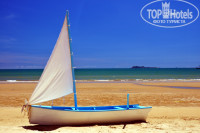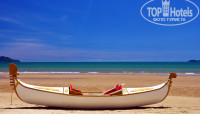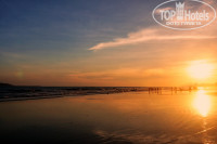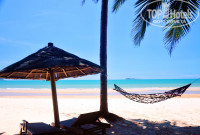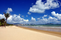 До пляжа идти минут 5 не спеша. На пляже кроме нас, 6 русских, никого не было - это большой плюс, как будто мы на нудистком пляже. Лежаки из под зонтов вытаскивать нельзя, это относится ко многим отелям Санья – это минус.