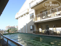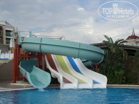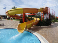 Вода в бассейнах была достаточно прохладная, но мы купались. Есть 2 бассейна, один 140 см., второй разделён на 115 см. и 50 см. Есть крытый бассейн. Было пять водных горок. Все они не очень быстрые. Под конец отдыха даже немного надоели.