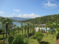 Номер с прекрасным видом на море. Красивая территория, много зелени, всюду чистота. Большой песчаный пляж, с хорошим заходом в воду. Лежаки, зонтики расставляли утром и убирали вечером. Их было так много, половина пустовали. Бассейны чистые.