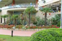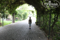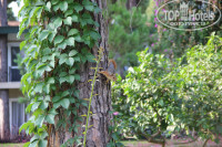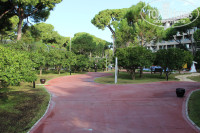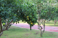 Территория отеля вытянутая,примерно 1 км от пляжа до шлагбаума. Вся зеленая,ухоженная. Растут апельсины,мандарины,оливки.