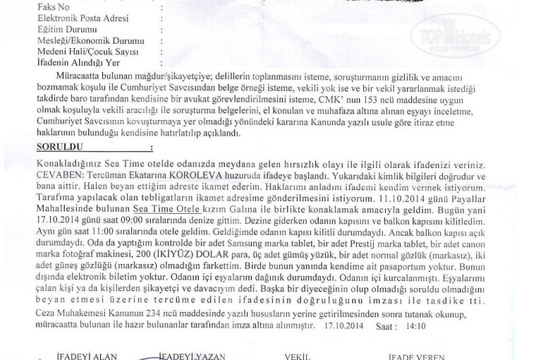 Отдыхали не первый раз в Турции и всегда были всем довольны, никогда не думала,что отдых может закончится таким кошмаром. Мы отдыхали с 11 октября, неожиданно 17 октября они решили закрыть отель,хотя мы должны были отдыхать до 21 числа. Из-за вынужденного переселения 17 числа мы собрали свои вещи и после 9 часов ушли на пляж, когда около 11 часов вернулись в номер обнаружили, что нас ограбили, самое ужасное,что украли паспорта, банковские карточки, деньги, кроме этого пропали лекарства папы (он гипертоник), мои очки ( - 8 диоптрий), фотоапарат, планшеты, и даже не побрезговали моей косметикой. До боли обидно,что пропали украшения, среди которых было кольцо семейная реликвия, последний подарок от дедушки. Когда я заметила пропажу, обратилась на ресепшен с просьбой вызвать полицию, представиеля тур агенства и связать меня с консульством, мою просьбу просто на просто игнорировали. На моё счастье у меня остался телефон и я смогла связаться с мамой и она продиктовала номер консульства. Пока я ждала жандармов и туроператора на ресепшене, никто не предложил даже стакан воды, а видя мои слезы, работники гостиницы ходили и ухмылялись. Только после того, как я связалась с консульством и оно стало звонить в отель, часа через полтора приехали жандармы. Жандармы не говорили не по русски, не по английски и хотя мы не говорим по турецки нам не пригласили переводчика, а представителя тур агенства они не захотели ждать. Долго нас возили,пересаживали из машины в машину, остановливаливась и выходили жандармы и администрация гостиницы возле какого-то дома, а нам было велено сидеть в машине. В конце концов мы всё-таки доехали до жандармерии, всю дорогу периодически мне звонили из консульства и наверно только поэтому мы остались живы. После того как в жандармерии были приняты наши заявления ( переводила какая то женщина даже не знаем,что она там напереводила) нас привезли обратно в гостиницу и только тогда взяли отпечатки пальцев у меня и еще 2 работниц гостиницы, хотя там работало не меньше 5 горничных. Этим дело не закончилось, когда я спросила у менеджера кто должен компенсировать украденное из номера, менеджер ( не знаю его имени, он так и не представился) сказал,что мы сами украли у себя вещи и устроил обыск наших оставшихся вещей на ресепшене ( есть фото). Такого унижения я не истпытывала в жизни, когда чужой человек, без всякого повода и разрешения, копается в моем белье. Когда папа сделал фотографию обыска на телефон, менеджер стал издеваться и начал делать счастливые селфи на фоне нас. Лично мне он угрожал расправой, если мы сию секунду не покинем гостиницу, я испугалась и мы тут же уехали. Сказать,что отпуск был испорчен это ничего не сказать, мы с ужасом оставшиеся дни ждали получим ли мы временные документы,чтобы вернуться домой или нет, и вообще останемся ли мы живыми. Признаться в том,что нам угрожали расправой я смогла только сегодня, когда вернулась домой, посколько переживала за здоровье отца, он гипертоник, а лекарство его украли. Есть фотографии обыска, есть копии заявлений из жандармерии, есть временные документы. Подтвердить наше прибывание в гостинице могут операторы тез-тура, консульство и жандармерия. НИКОМУ И НИКОГДА НЕ СОВЕТУЮ ЕХАТЬ В ЭТУ ГОСТИНИЦУ ВАШ ОТПУСК МОЖЕТ ЗАКОНЧИТСЯ ТАКИМ ЖЕ КОШМАРОМ!