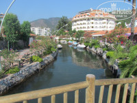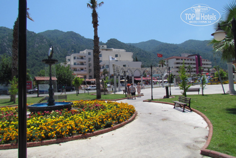 Располагается отель в живописном месте, вокруг высоченные горы, очень красиво. Магазины рядом, кафешки рядом.