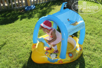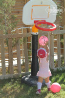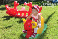 Детская площадка скромная, для 2-3 летнего ребенка пойдет, для постарше будет скучно. Есть детская горка, 2 качалки, баскетбольное кольцо и надувной кораблик.