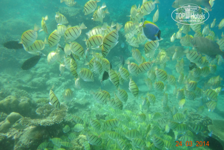 Риф хороший, но всё портят волнорезы, по всему периметру. Портят не в плане красоты (их действительно визуально перестаешь замечать на второй день), а в плане неудобства снорка. Такое чувство, что большую часть рифа съедает основание этих самых волнорезов. Выход за эти волнорезы нормальный только в одном месте, где заходят-выходят дайверы. В остальных местах, якобы предназначенных для входа-выхода можно проплыть только в прилив (и то с трудом, особенно с ветреной стороны, т.к. было чувство, что тебя расплющит об этот волнорез). Сложилось впечатление, что когда-то там были прорублены нормальные каналы, но со временем волнорезы стали разрушаться и теперь от этих каналов остались одни воспоминания. Из приятных воспоминаний только рыбы всех мастей, черепахи и дельфины. На них готова любоваться бесконечно.