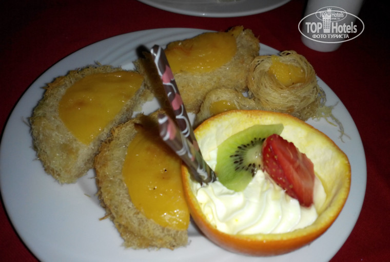 Здесь на пляже есть ресторан Beach Club в котором можно вкусно пообедать.Все меню очень вкусное,спасибо поварам!Также огромное спасибо обслуживающему персоналу,молодцы ребята , обслуживают быстро с улыбками на лицах!Кстати здесь напитки не разбавленные как в других ресторанах,очень вкусное мороженное! Затронув тему о еде, хочу сказать что в основном ресторане Sharm где шведский стол, готовят тоже вкусно, разнообразие блюд не большое,но голодными не будите!Всегда была курица,мясо ягненка,утка,рыба.По фруктам у нас были мандарины,апельсины,хурма,бананы,финики-супер,клубника.Огромная благодарность шеф поварам!