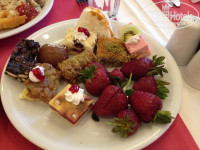 Ресторан большой, места много, чисто. Мальчики моментально убирают грязную посуду и накрывают заново столы. Скатерти чистые. Еды очень большой выбор. Была курятина, телятина, баранина, индюшатина, рыба, всякие запеканки, рис, вермишель, картошка в разных видах, овощи на гриле. Так все и не перечислить. Супы не пробовали. Большой выбор салатов и солений. Огромный выбор разной брынзы, сыров, оливок и маслин. Много всяких десертов, тортиков, пирожных, пудингов, йогуртов. Была халва, лукум, инжир, курага, изюм. Из фруктов были яблоки, апельсины, грейпфруты, бананы, клубника, груши. Была маринованная черешня и маринованные персики. Есть диетические блюда и отварные овощи. Все красиво оформлено. Есть детские стульчики. Делают апельсиновые фреши за 1 евро.