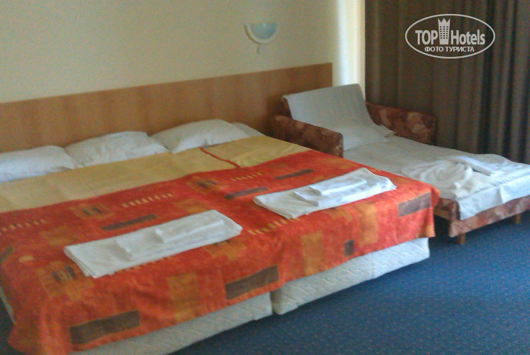 Отдыхали в конце июня, начале июля 2014. Заселили сразу в огромный номер на 2 взрослых и 2 детей. Хотя нас было 2 взрослых и 1 ребенок. Питание хорошее. Кому йогурты, cалаты, мороженое, мясо, рыба, гречка Все было. Полотенца, гели мыло, все есть. Отель находится в стороне от других. Для семьи -спокойный отдых. Кто критикует питание, так лучше чем в трешке Турции намного. Макароны я не заметила.. По поводу уборки- убирают, а если оставите хоть раз 2 лева чаевых то регулярно!...)))