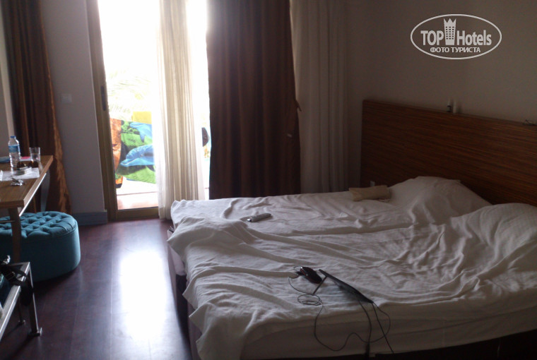 Ну и собственно отель Novia Gelidonya – постараюсь рассказать все по порядку. Отдыхали мы в нем в конце мая. Около 13:00 нас (две молодые пары) привезли в отель, но заселение было с 14:00. Нам сразу же выдали браслеты и предложили пойти пообедать, пока подготавливаются номера. All inclusive начался! Об еде расскажу чуть позже, а пока, после обеда, мы вернулись на ресепшн. И тут нам сообщили, что отель переполнен, и предложили на время (на две ночи) поселиться вчетвером в двухкомнатный номер. Стало немного грустно, и чтобы скрасить инцидент, администрация предложила нам небольшие бонусы от отеля. Мы согласились, хотя настроение было подпорчено. Но отель сдержал слово, и через два дня нам дали дополнительный отдельный номер на этом же этаже (№3312), а тот двухкомнатный оставили нашим друзьям. Оба номера были просторные, все работало, не было ни потертостей, ни ржавчины, ни других неблагоприятных явлений. Фото номеров предоставляю. В номере есть холодильник, телевизор, фен и пару стаканов. Розеток мне не хватило, брал с собой отдельно тройник. Санузел совмещённый с душевой кабинкой. Порадовало наличие пуфика и журнального столика, разочаровало отсутствие тумбочки. Здесь уже писали, что днем поспать трудно (так и есть), так как около 15:00 продолжается анимационная программа. Музыка реально играет громко, и именно в нашем четвертом корпусе спать было невозможно. Посетители говорили, что в третьем корпусе потише. Балкон небольшой. Вид из номера на сад и бассейны. Где-то вдалеке, между пятизвездочными отелями, виднелось море.