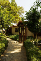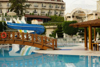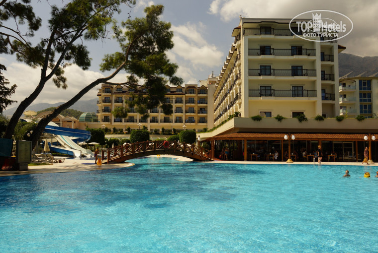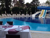 Территория отеля компактная, но очень уютная, расслабляющая. Много зелени, цветов. Рядом небольшой пруд с гусями и утками. В тени сосен расположился гёзлеме хаус, где пекутся изумительные лепёшки с разными начинками, рядом автомат с айраном и айс-ти. В баре у бассейна всегда можно перекусить пиццей, фри, овощными салатами, фруктами. Ежедневно после 16.00 угощали мороженым. Карамельное, клубничное, шоколадное! Вкусно! Кто там жаловался на очереди – специально для Вас фото. В 17.00 предлагают сладкую выпечку у бассейна. Завтраки, обеды, ужины проходят в главном ресторане. Разместиться можно как в самом здании, так и на улице. Еда достаточно разнообразна, хорошо приготовлена, порадовал сладкий стол. Очень пришлись по вкусу шоколадные брауни с банановой начинкой и миндальными лепестками. Вечером приятно посидеть с чашечкой турецкого кофе в лобби. При отеле есть магазинчики, продавцы приветливы и ненавязчивы. Привет отельному фотографу, брали фотосессию, понравилось. Фотографии записывает на свой диск, на Вашу флешку. При желании – распечатает, но это дорого.