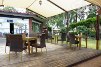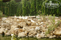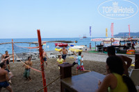 Море – сказка! Изумрудное, кристальное, манящее. Вход вполне комфортный, мелкая галечка, есть пирс. Лежаков хватало всегда и всем. Мы, тенелюбивые, располагались на замечательной террасе под ароматными соснами. Душ с пресной водой присутствует, водные развлечения – тоже, у прудика с утками.