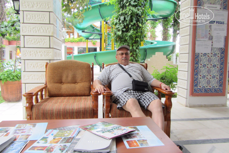 Если ваши средства позволяют вам отдыхать в отеле класса " 3 " звезды то это один из приемлемых вариантов. Самая типичная ТРОЙКА. Описываю абсолютно беспристрастно потому, что отдых в принципе понравился и не каких суровых претензий у нас не возникло. Прибыли мы 27.05.15 после 14-00 так , что заселили моментально. Корпус "В" № 404. Большой номер. Две кровати 2-х и 1,5 -х спальные. телевизор махонький в 3 канала, который мы и не смотрели. Не до него как то было, бормотал там какие то новости. Зеркало, стол с ящиками , тумба прикроватная. Большой плательный шкаф. Очень тусклое освещение, даже при всех включенных лампах. Ну это на любителя. Прекрасные матрасы,очень удобные. Душевая комната вроде и большая, но каменная столешница закрывает большую часть пространства. Кабина душевая маленькая. Кое где подзаржавело, где то швы между плитками почернели, но это инфа для шибко брезгливых. Уборка видимо зависит от смены, один раз аккуратно все разложат, другой раз просто полы помоют. Чаевые мы не оставляли, может по этому ))) Нам это было как то по барабану. Еда в ресторане достаточно однообразна, что в принципе в любой тройке. Постоянно, что то готовили на ужин на огне. Один раз была шаурма , один раз рыба. все остальные разы что то с чем то жарили , было съедобно и достаточно вкусно . Очереди образовывались , но буквально через 10-15 минут можно было все взять не суетясь и без толкучки. Столов много. Скатерти стираные, но скорее застиранные, по этому вид их может показаться особым ценителям и не ахти. За наше время ни кто не возмущался грязью в ресторане. Персонал расторопный и услужливый , грех хаять. Территория большая, много зелени. Два бассейна. Среди туристов очень много пожилых людей и детей. Вечером детская анимация, затем танцульки для взрослых. Один серьезный, при серьезный косяк . Все эти танцы во внутреннем дворе и все окна корпусов во внутрь двора. И вся эта хрень , от шансона до местной попсы с диким грохотом тебе в номер до 24-00. Первую половину отдыха я правда отрубался до 24-00 Но когда выспался то это конечно раздражало прилично. Пляж это конечно отдельная статья. Очень крупные камни. Без обуви заходить только по пирсу. Аквашузы можно купить в магазинчиках . От 3 до 7 баксов. Территория отельного пляжа очень маленькая, метров 15-20. Все топчаны стоят вплотную друг к другу. Зонты какие то плетеные, низко установлены. Башкой постяно об них долбишься Много драных матрасов. Вот только из за пляжа портится общее впечатление. Назвать воду в мае теплой язык не поворачивается, но купаться можно, что все охотно и делают.