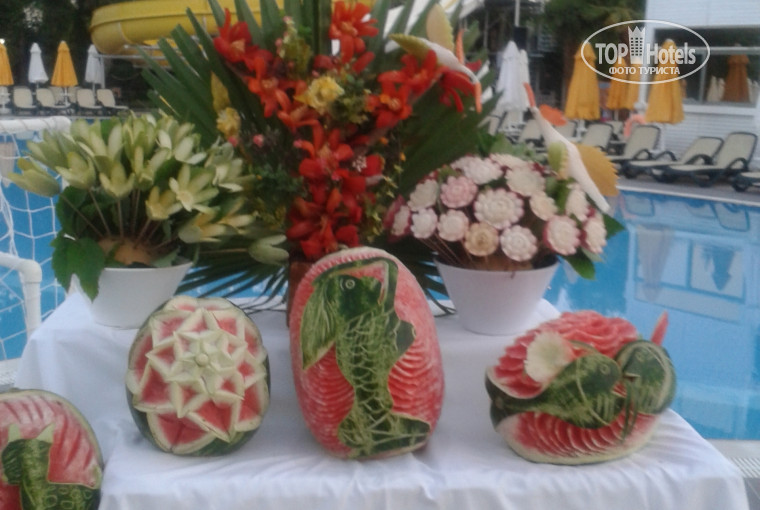 Питание как всегда на высоте, разнообразно и вкусно! !! Говядина, баранина, курица, индейка, рыба. Различные овощи, как свежие, так и гриль, либо тушеные. Десертов огромное количество. Из фруктов: абрикосы, яблоки, груши, апельсины, грейпфруты, арбузы, дыни. Алкоголь качественный, бармены радовали разнообразными коктейлями!!! В понедельник проводится турецкая ночь, с традиционными угощениями и танцами! Посетили итальянскии ресторан, ничего особенного.