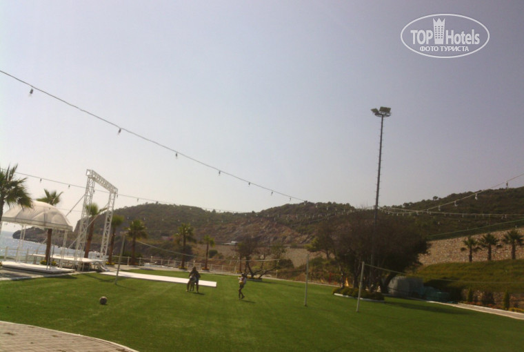 Для тех кто ещё не понял по фотографиям, что отель стоит на склоне горы, ещё раз хочу отметить,что, действительно, там везде лестницы, куда бы ты не пошел. Поэтому людям пожилым,я бы,наверное, не стала советовать ехать в этот отель. Лично у нас первые три дня очень болели икры с непривычки, но потом, конечно, все прошло. Потому как кормили вкусно, а отказаться мы не могли, то были очень рады, что есть возможность хоть как то сбросить лишние калории. Территория отеля, как такого, небольшая, но зеленая и красивая. Есть стол для настольного тенниса,есть мягкая качель для отдыха, так же имеются две детские площадки: одна из них у отеля,другая на пляжу. Как мне показалось, большую площадь занимает прибрежная территория. Огромное воллейбольное поле, бар с крытой мансардой, здесь можно посидеть в тени за столиком, подождать лепешки, которые очень вкусно печет женщина с 11 до 17. Кстати, бар работает по этому же расписанию. Тут дают пиво, колу,спрайт, фанту и сок. Так же имеется кулер с питьевой водой.